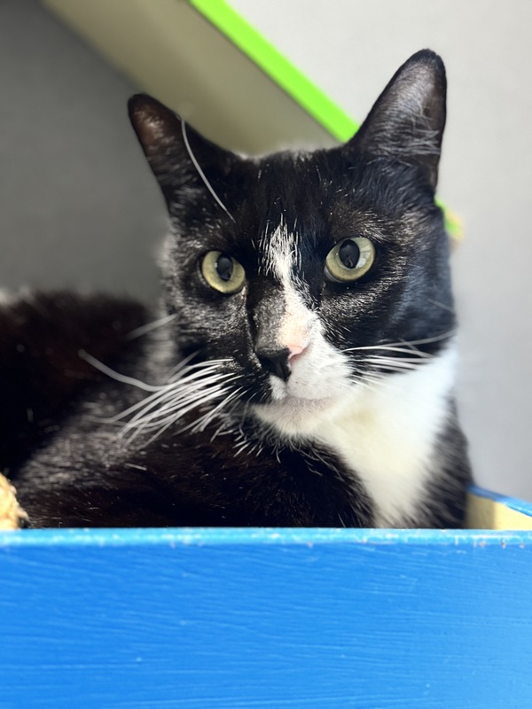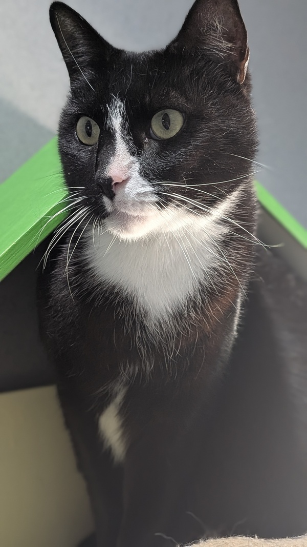 I am a tuxedo cat. I am timid to begin with so go slowly with me, once i warm up I have a love for cuddles and a knack for making friends. I long for a house in which to play and cuddle up on a chair. I adore being around people, sharing warm laps and soft pets. If you're looking for a companion who understands the art of friendship and comfort, I'm your guy. Adopt me and let's share a life of love and mutual understanding.