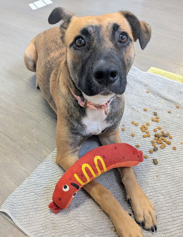 Kinsley should be welcomed indoors as part of the family, with her own cozy crate or "den" where she can retreat when feeling unsure. Once she trusts you, she bonds quickly and shows her gentle, loving nature. She's beginning to enjoy playtime, especially with soft squeaky toys, and it's wonderful to see her curiosity growing.