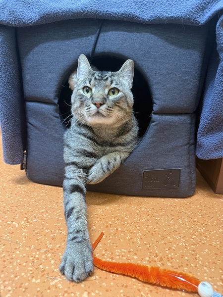 Introducing Eeyore! This lovely five year old male kitty came to us via our ambulance team. Eeyore had been sadly caught in a trap and had sustained some wounds, but was fairly quickly treated by our medical team. Understandably he was a little timid and flighty on first arrival and still has some touch avoidance around his face. Nevertheless, Eeyore leans in for affection and will solicit affection in turn. While he's really come out of his shell, he'll still hide away in a secure spot during the busier times of the day at the Centre. So, Eeyore will need to be started in a small launch room when he first arrives home. Being a food lover is a sure way to his heart so that is a good strategy for building his confidence and connection. We recommend scratch posts/cat trees and hide places like cardboard boxes and cat igloos for him, as well as high and low places to investigate. An understanding and patient adopter is Eeyore's ideal and will be rewarded in the long run as this little guy is a keeper. Older children who understand cat body language rather than littlies is recommended. While Eeyore has been untested with other cats, he does not seem to be phased by other felines around him. And he may do okay with a calm social dog as long as the interactions are monitored. With all that said, Eeyore would make a fine feline friend for a loving family.