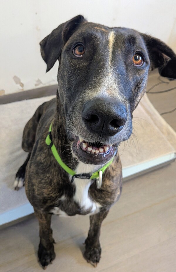 Rachel is our "larger‑than‑life" brindle girl with a heart of pure gold. Friendly, social, and wonderfully affectionate, she's the type of dog who will make herself at home in just about any loving household. Despite her impressive size, Rachel is convinced she's a lap dog-and she'll happily snuggle up with her people whenever she gets the chance.