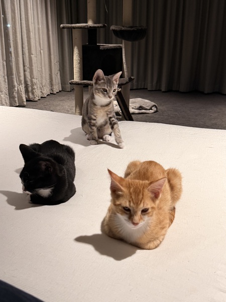I'm a sweet, gentle kitten who loves attention, soft pats, and curling up somewhere warm. I enjoy exploring, playing with toys, and showing off my pretty pattern when I stretch out for a nap.