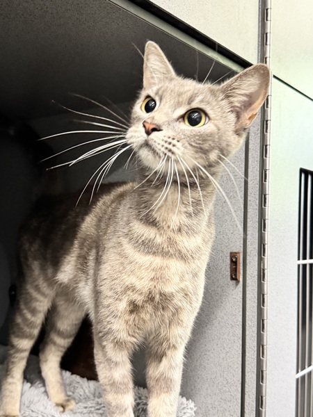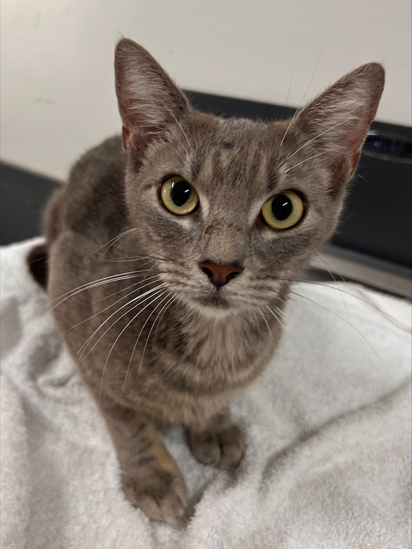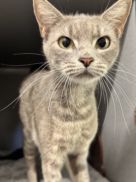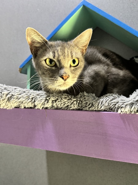 I have a very serious face you see but a very sweet temperament! I can be a little shy at first but give me time and I am a real smooch and a curious girl! I love to give the staff here lots of kisses and head bops! I also work fulltime at the Biscuit Factory, so if you adopt me, just know I have to make my daily quota of Biscuits. My ideal day would be spent snoozing on your couch or in a sunbeam all day and getting pats and scratches when you get home, and of course lots of food! I would love a home with kids that know how to give me my space until I feel safe. Staff haven't seen me interact with other cats, but a slow and proper introduction should ensure I get along with an existing kitty in your home.