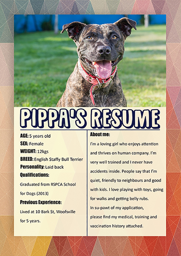 • Write a pet resume: list your pet’s likes, dislikes and personality traits, certificates of vaccination, desexing and training.